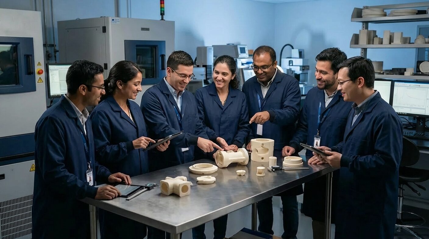 A equipe técnica da Teccer é formada por profissionais especializados em materiais cerâmicos, com experiência em engenharia de processos, desenvolvimento de formulações e controle de qualidade. Essa expertise nos permite oferecer soluções personalizadas, desde protótipos e amostras de laboratório até séries industriais completas.